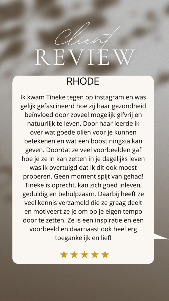 Ik hou van nuchter en praktisch. Je hoeft echt niet in een keer je hele leefstijl om te gooien, kleine stappen maken vaak al een groot verschil. Ik help je stap voor stap naar meer gezondheid. Ook krijg je op deze manier steeds meer tools in huis tijdens een periode van ziekte of ongemak. Ik hou van persoonlijke begeleiding en heb dus ook een whatsapp groepje met al mijn klanten waarin ik regelmatig beschikbaar ben voor vragen.